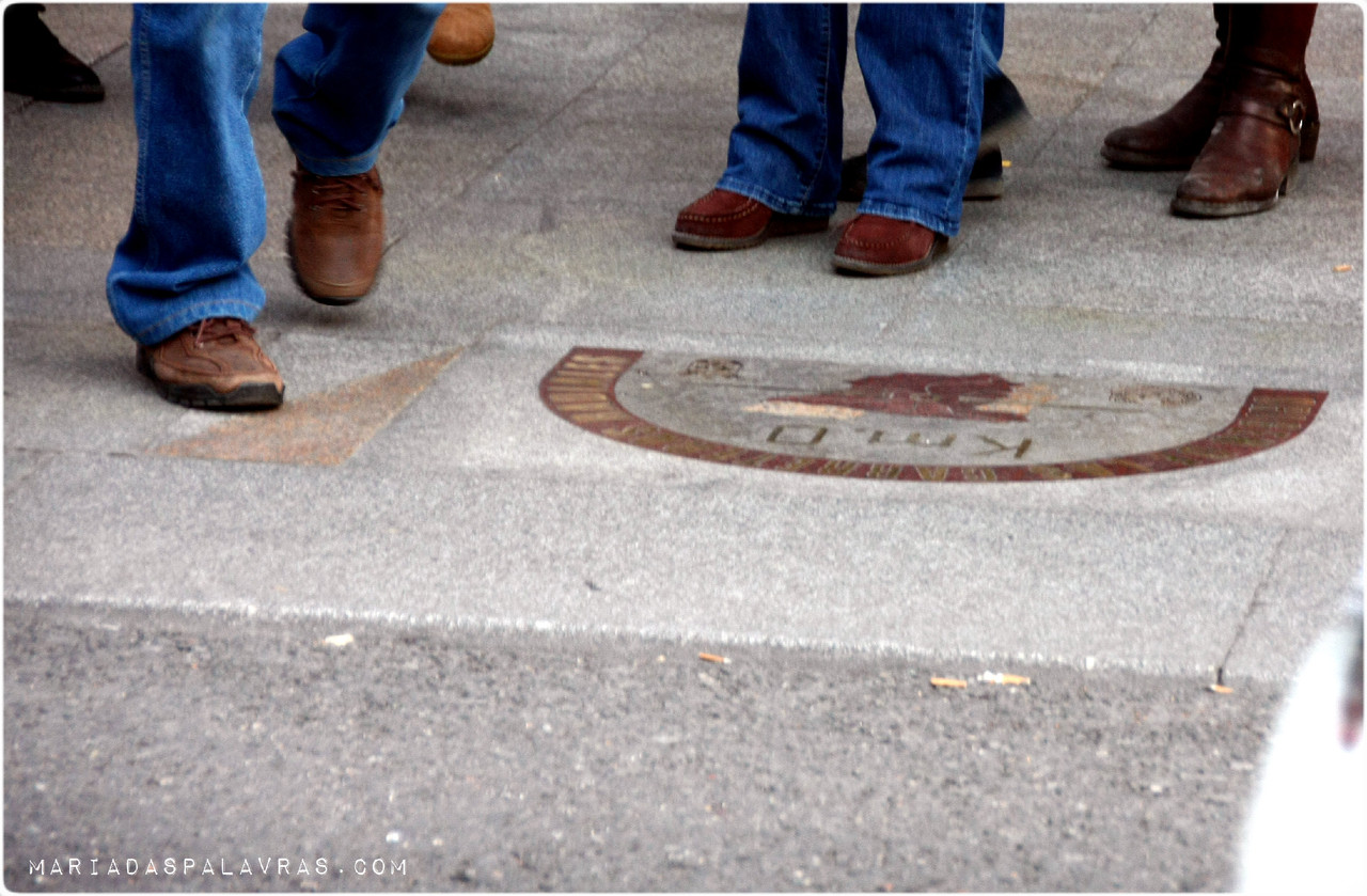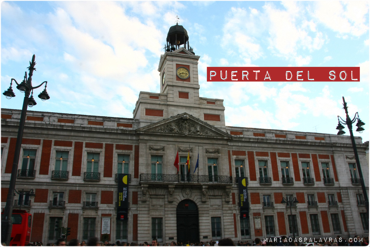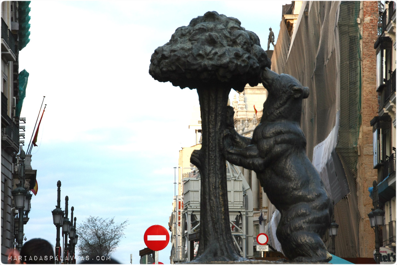 A seguir, descemos para a Puerta del Sol. A que não achei gracinha nenhuma. Talvez porque estava cheia de turistas (mais recheada de gente do que o estádio onde tínhamos acabado de estar), talvez porque ainda não estava suficientemente escuro para estar iluminada, talvez porque face ao resto não me tenha impressionado, pronto. O afamado Kilómetro Zero, de onde partem todas as estradas de Espanha está marcado no chão, mesmo em frente ao edifício principal, mas está sobretudo marcado por dezenas de pessoas em tufos a querer tirar uma foto com o pé lá. O que eu queria mesmo encontrar era o urso, o que serve de símbolo à cidade. E depois de navegar por marés de turistas até ao fundo da Praça (no lado oposto ao km 0) lá vimos o urso a agarrar...o bróculo!