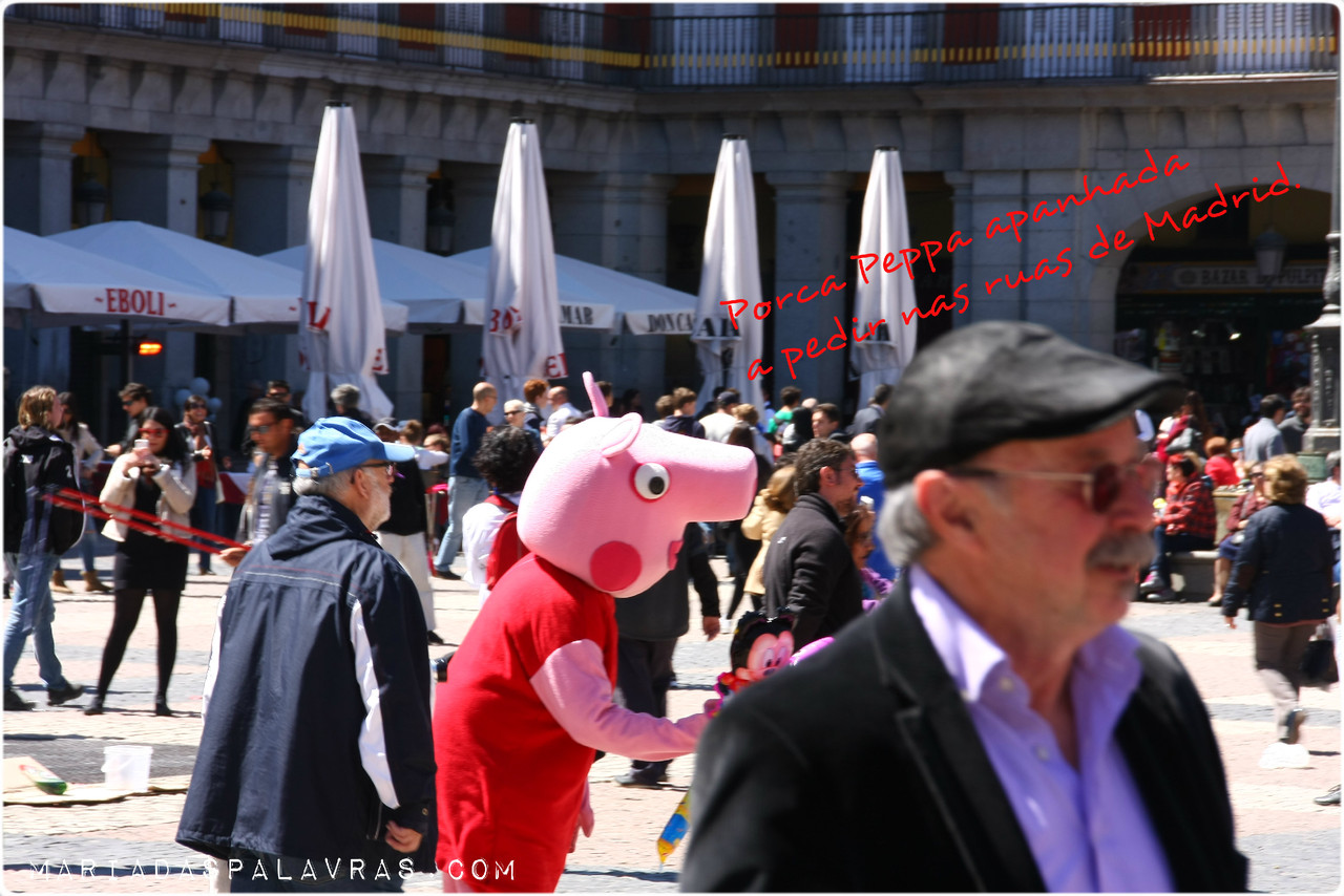 Antes de irmos para o estádio ainda passámos à Plaza Mayor que é mesmo ao lado do Mercado de San Miguel (já vos disse que em Madrid é tudo a um passinho?) onde comecei a ver os dois fenómenos pedincheiros mais frequentes da cidade: gente mascarada de personagens da Disney e afins - a sério, vi Minnies, porcas Peppas e o diabo a quatro, e homens-estátua de versão evoluída em posições em que o homem fica de lado suspenso no ar (que é como quem diz, que dá ainda menos trabalho que os homens-estátua comuns que têm de estar em pé e não deitados num suporte rígido). Vejam a galeria de fotos da Plaza Mayor e da zona da Ópera onde apanhámos o metro a seguir para ir para o estádio.